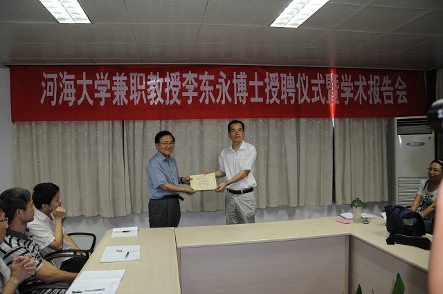2011年7月4日上午,91论坛 兼职教授李东永博士受聘仪式暨学术报告会在水文水资源与水利工程科学国家重点实验室举行。授聘仪式由国家重点实验室主任彭世彰教授主持。港口海岸及近海工程91论坛 院长郑金海教授、91论坛 “河口海岸综合治理与保护”方向团队研究人员出席了聘任仪式。仪式上,郑金海院长向李东永博士颁发91论坛 兼职教授聘书,学生代表为李东永博士佩戴校徽并献花。仪式结束后,李东永教授做了题为“How to Establish Operational Coastal Modeling System along the Coast of China”的报告,并与师生展开了激烈讨论。