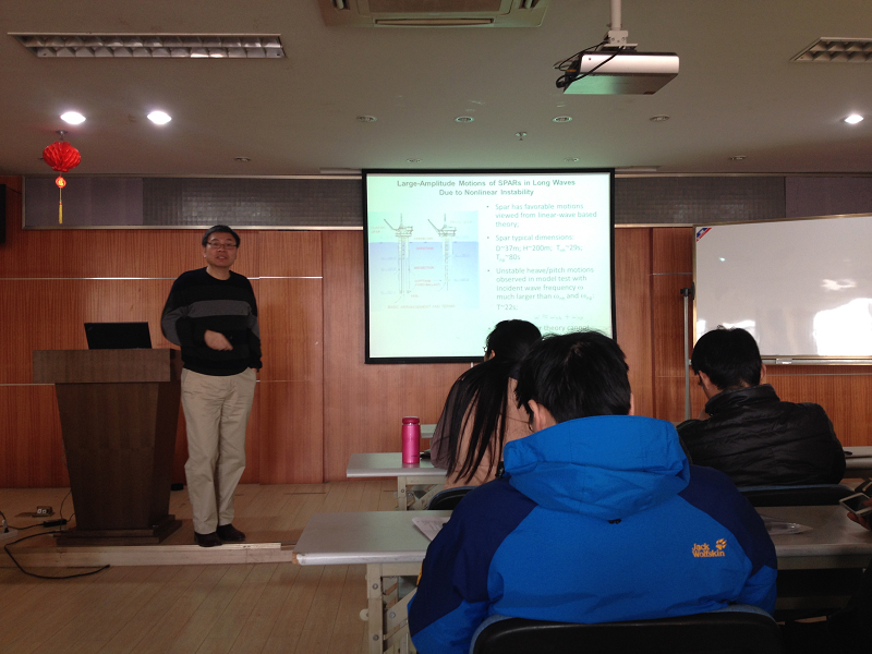 二十几年的研究积累,针对海洋工程水动力学问题中的前沿成果和研究方法进行了系统的报告。重点对其负责的随机海浪场预测的研究方向进行了讲述,同时还介绍了波浪与固定及浮式海洋平台的相互作用,介绍了波浪能发电相关的系列水动力学问题,并与广大师生进行了融洽的学术探讨。