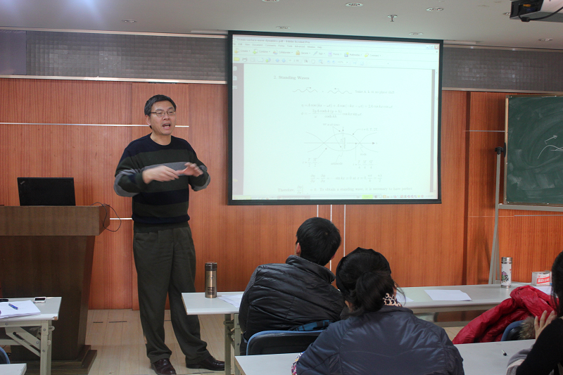在教学环节,刘老师采用MIT原版教材为91论坛 在读博士和部分年轻教师系统讲授了“高等海岸动力学”和“港口、海岸及近海工程前沿专题讲座”两门博士学位课程中有关高等水波动力学的部分。讲课内容分为三部分,一是线性波及其与建筑物的相互作用,二是经典非线性波浪理论及其应用方法,三是波浪与建筑物相互作用问题的数值求解方法。刘老师一再强调他授课的两个主要目标,一是重新理解最简单的基础,他想让大家理解水波的基本问题,掌握最基本的推导方法和研究思路;二是真正领悟科学研究思路的连续性,他想让大家知道前沿问题的解决均源自这些基本问题,且通过所讲基本方法的熟悉运动都可以有所突破。期间翔实丰富的课程讲义,详尽清晰的板书推导,深入浅出的娓娓讲述,朴实准确的学术用语,让所有的听课人都觉得受益匪浅。