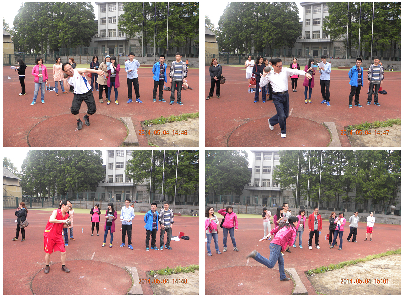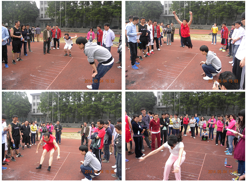 比赛开始后,整个运动场洋溢着欢畅的氛围,加油声,欢笑声交织在一起,此消彼长,毫不间断。为了体现比赛的公正合理,个人项目根据年龄的差异分为青年组和中年组。但在比赛中,中年组毫不逊于青年组,100米和1000米的决赛大家都使出浑身的解数,奋力冲刺,激烈角逐,充满了活力;在男子铅球决赛中,青年组的严士常以9.37m夺得第一,而中年组的第一名陈永平也达到了8.9m。在跳长绳比赛中,教职工们都显得无比默契,尤其是制图队,以两分钟120跳的高分拿下第一。最有趣的当属趣味项目中的袋鼠跳接力、两人三足、跳长绳等,逗得现场观众合不拢嘴。袋鼠跳比赛中,有的教职工被绊倒,没等站稳又继续跳,接着又绊倒,又匆忙起身跳,一路跌跌撞撞奔向终点,逗得观众前仰后合。亲子项目踩气球更是考验了孩子与父母之间的默契。参赛的教职工们在锻炼自己的同时,也为观众奉献了精彩的视觉盛宴。一场场比赛,一阵阵笑声,无论哪个组别的参赛者仿佛都沉浸在无限的青春和活力之中。