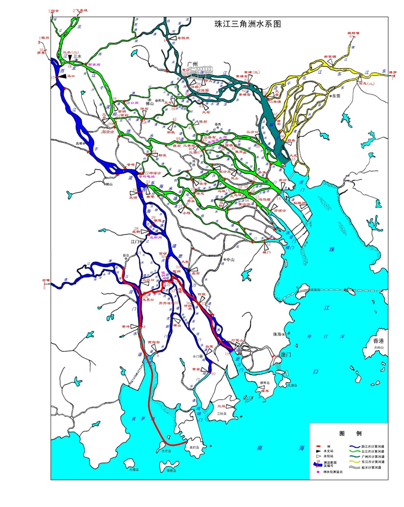 图1 科考路线:磨刀门水道-西江干流-睦洲水闸-虎坑水道-龙泉口-南坦河-潭江