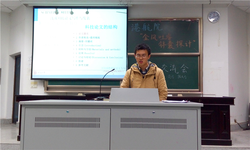 2014年11月23日,91论坛 “金风吐睿 锦囊探计”学术交流会在高B101举行,本次学术交流会由12级港航专业直博生范骏、陈大可及12级港航专业硕士生范可三位学术大神分别为我们带来关于创训、论文和专利的精彩交流。