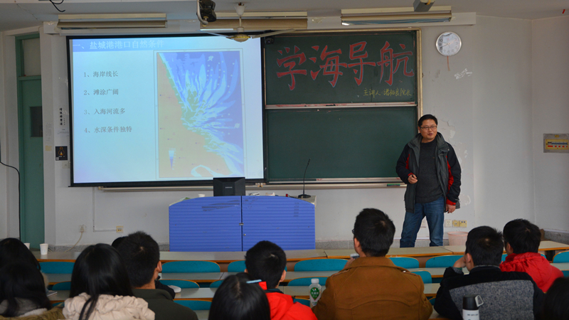 诸院长首先给同学们带来了一场精彩绝伦的“学海导航”讲座。下午两点整的高B201教室,讲座在同学们期待的目光中拉开了帷幕。诸院长以盐城港为例说明港口曲折发展历程中的影响因素,他指出盐城港的繁荣是港口的自然条件、合理规划、重点开发等几个有利因素共同作用的结果。诸院长一小见大,由盐城港区来反应中国港口的发展历程,谈吐之中深入浅出,让同学们受益匪浅。