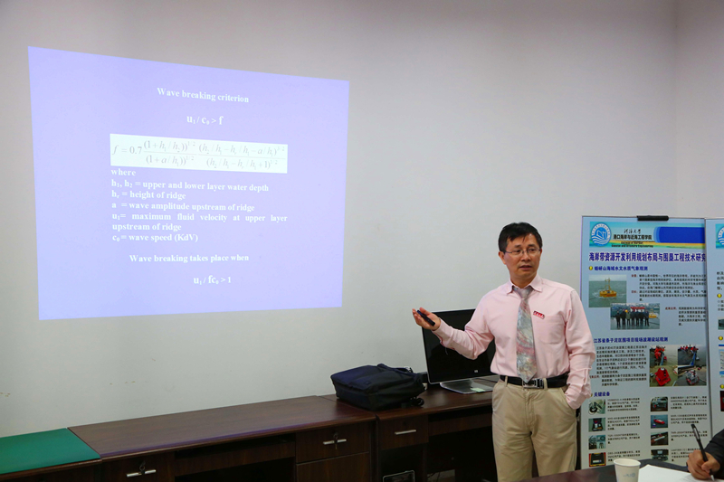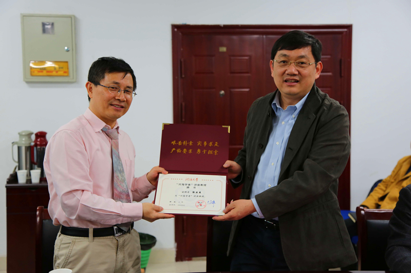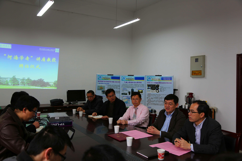 On the morning of March 22nd, an appointment ceremony of “Hohai Scholar” was held in Experiment Center of Harbour and Waterway Engineering and Coastal Ocean Science. Professor Yakun Guo from University of Bradford, UK was appointed as “Hohai Scholar” visiting professor. Vice-President Hongwu Tang, Dean Jinhai Zheng, Assistant Dean Jisheng Zhang and some teachers and students participated. After the ceremony, Prof. Guo gave a seminar titled “Modeling study of internal solitary waves over a bottom ridge”.