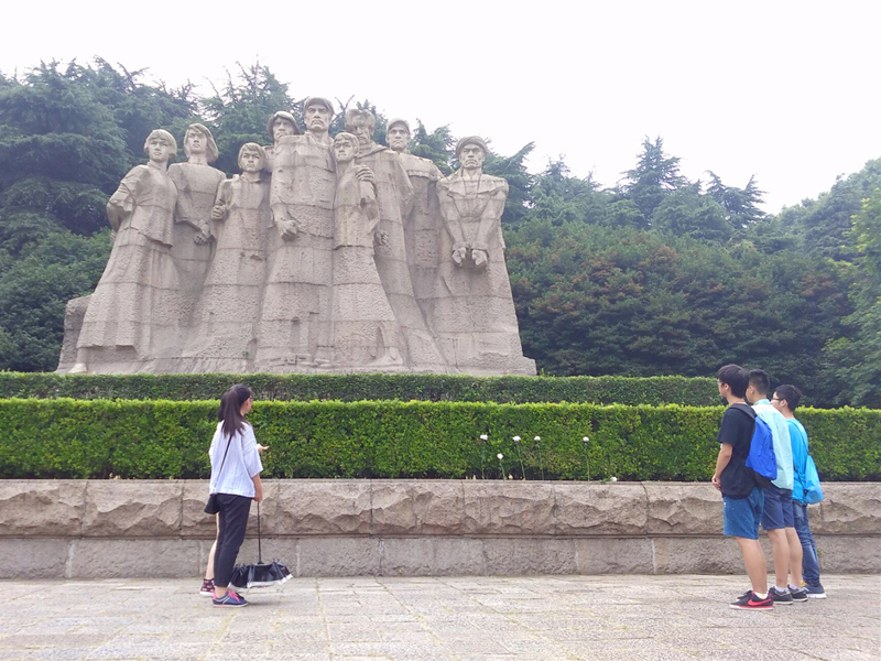 7月16日,队员们前往雨花台。在雨花台爱国教育基地中,队员们被其中的影视资料深深震撼,感受到和平来之不易,是用烈士们的鲜血换来的。队员们望着那高大的纪念碑久久不能释怀。纪念碑高耸入云,在整个雨花台的中央,其庄严肃穆体现了后人的悲痛与哀思。最后队员们来到气势磅礴的烈士就义群雕,这座群雕有十米多高,九位烈士气宇轩昂,震撼人心,影影约约与纪念碑相呼应,引发深思。