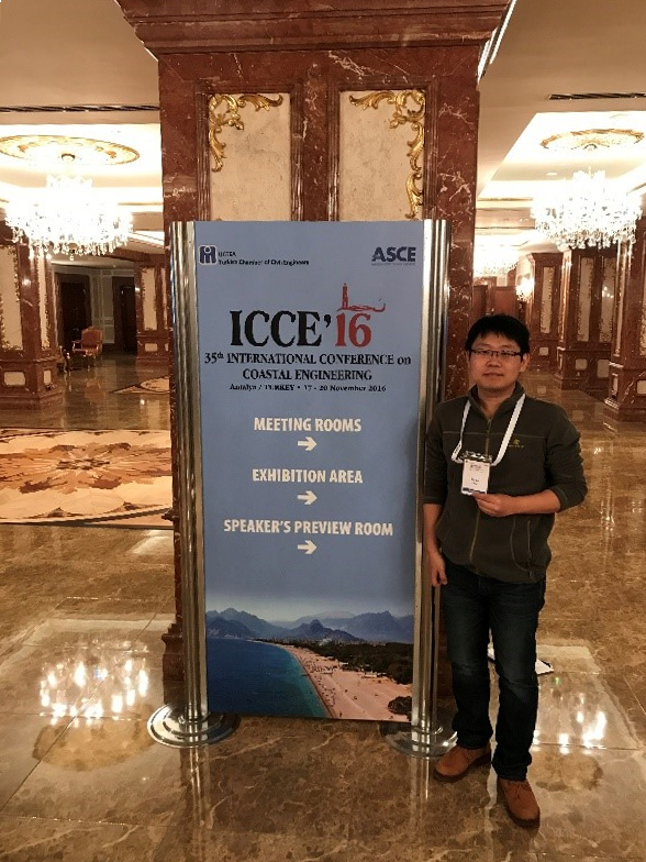 2016年11月17日至22日,91论坛 隋倜倜博士参加了在土耳其安塔利亚召开的第35届海岸工程国际会议(International Conference on Coastal Engineering)。隋倜倜博士做了题为“Effects of Pile Displacement on its Surrounding Seabed Response Under 3D Wave Loading”的报告,介绍了自己最新的研究成果,并与国际同行开展广泛交流。