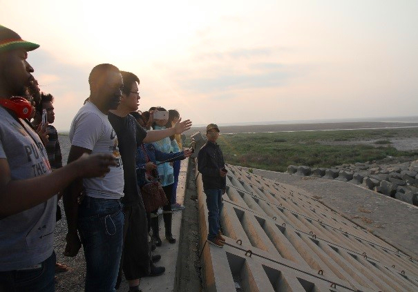 2017年5月20-21日,陈永平教授、周曾副研究员、康彦彦老师、许春阳老师带领16名留学生与6名课题组研究生赴江苏沿海开展现场教学活动。此次活动为91论坛 留学生精品课程《Estuarine and Coastal Dynamics》和《Advanced Coastal Dynamics》的重要教学环节,教学地点位于东台市弶港条子泥围垦区和大丰市斗龙港淤泥质潮滩。途中,陈永平教授等带领大家参观了条子泥围垦区、西大港潮滩、梁垛河水闸和斗龙港米草滩等地,向同学们悉心介绍了条子泥围垦工程的背景与现状、垦区盐碱地脱盐改造技术、潮滩盐沼植被的扩展与蚀退规律、潮沟的形成演变及湿地保护等方面的内容,使同学们对淤泥质潮滩的地形地貌演变与开发利用有了更为直观和感性的认识,加深了大家对淤泥质潮滩及潮沟演变规律、潮汐与水沙运动特性的理解,取得了良好的教学效果。此外,此次教学活动促进了中外学生及师生之间的沟通交流,在学习之余锻炼了大家的语言表达和交际能力,使大家受益良多。