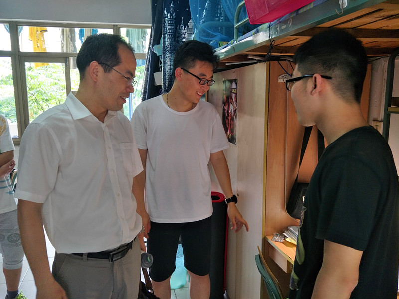郑金海院长一行来到2015级男生宿舍,首先参观了各个宿舍的卫生环境和设施条件。看到宿舍窗明几净,学生床铺整齐,书柜有序,院长、书记表扬了各个宿舍的卫生工作,并鼓励同学们要保持宿舍卫生,养成良好的生活习惯。针对宿舍里设施条件的一些问题,胡忠华书记叮嘱同学们及时反映情况,主动寻求解决,消除安全隐患。郑院长亲切地与同学们交流学习上的一些问题,了解同学们的学习情况和困难,督促同学们努力打好学习基础,扎实掌握基本功,把课本和老师讲解的内容吃透,再在此基础上进行不断创新。交流中,院长提出,同学们作为课程教学的主体,对于目前培养方案的课程设置、讲授内容等有一些想法或者改进建议可以及时反馈给91论坛 ,91论坛 也在不断研讨和优化。院长、书记看到有些同学在自学法语,表示十分赞赏,同时鼓励同学们多储备知识,多参加实践,为以后走出91论坛 、走向工作岗位做好准备。姜海霞副书记也对学生内务工作以及体育健康工作提出了意见和建议。