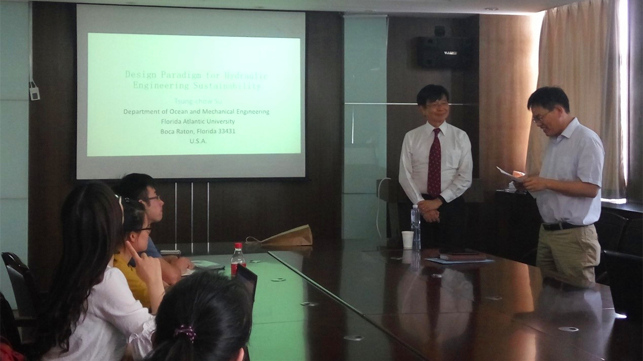 上午,苏教授和谢副教授在黄挺老师带领下先后参观了水文水资源与水利工程科学国家重点实验室和91论坛 港口航道工程与海岸海洋科学实验中心。下午,苏教授在严恺馆会议室做了题为“Design Paradigm for Hydraulic Engineering Sustainability”的学术报告,针对流固耦合、泥沙输运以及工程冲刷防护等问题,介绍了水利工程结构的永续性设计及优化研究。苏教授从中国古代哲学的视角出发,揭示了众多问题复杂表象后的核心实质和解决方案,传递了“大道至简”的科研理念,为参会人员开展科研工作带来了新颖的思路,引发了热烈地交流与探讨。会议由副院长张继生教授主持,来自91论坛 和水文院的20多位师生参加。