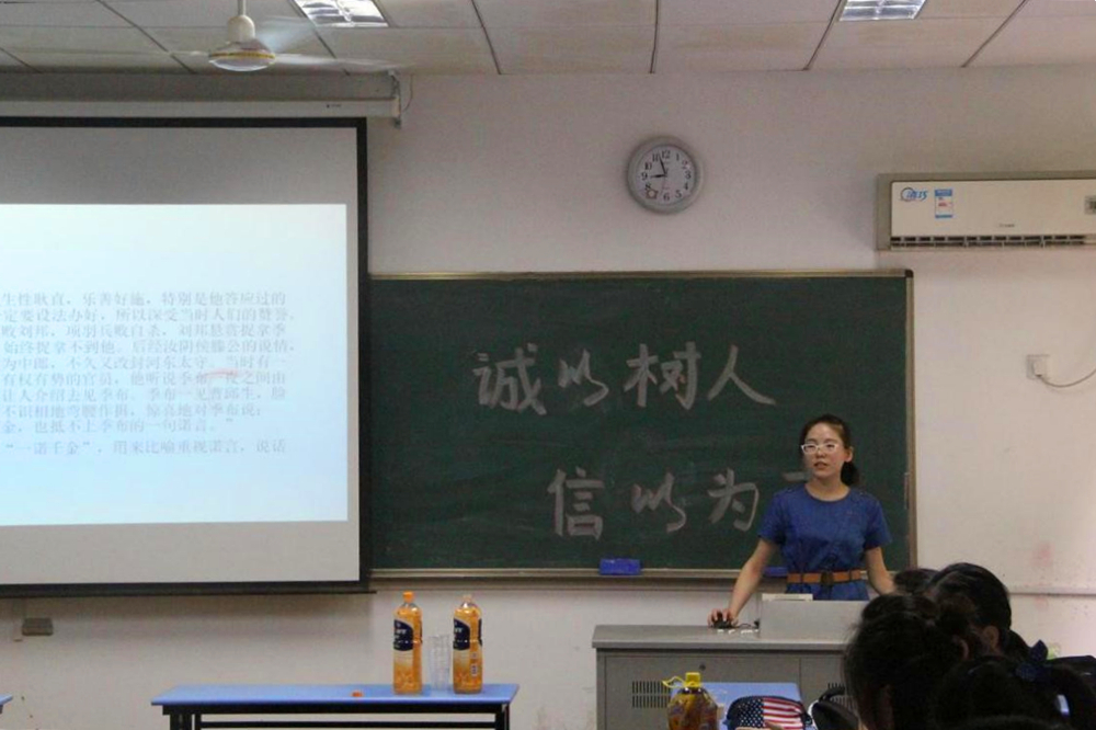 本次班会由生活委员郭文文主持,活动分为“何为诚信”、“诚信公益广告”和“诚信小品”三个环节。在“何为诚信”环节,主持人以孔子等名人的“人而无信不知其可也”等名言警句为同学们介绍了古人所理解的诚信。接着,主持人结合“诚信公益广告”,举例说明当今大学生中常见的诚信危机现象。为了让同学们对诚信有更直观的理解,龚姚杰等同学通过表演小品,为大家生动剖析了“诚信是金”的故事。在欣赏节目的同时,台下的同学们开始反思,对自己失信行为进行自我评价,将结果写在了纸条上。最后,郭文文总结了本次班会,提出了关于大学生诚信守则的倡议,得到同学们的一致认可。
