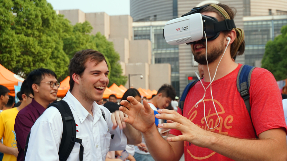 下午4点,游园会活动正式开始,此次91论坛 的“VR”展台活动分为:扎气球、你画我猜、表情包大作战和“VR”展台四个部分。扎气球活动考验着参与者的专注度和维持平稳心态的能力,你画我猜与表情包大作战则充分考量着参与者之间的默契与信任,一系列趣味十足的心理小游戏吸引了许多同学前来参与,而高科技VR更是将本次游园会推向了高潮,同学们争相前来体验,甚至吸引了不少外国友人,让91论坛 的展台充满了欢声笑语,一跃成为人气最高的展台。