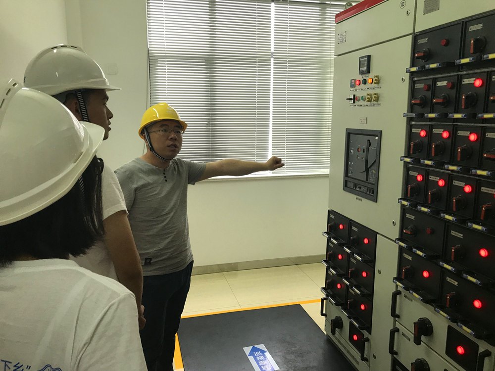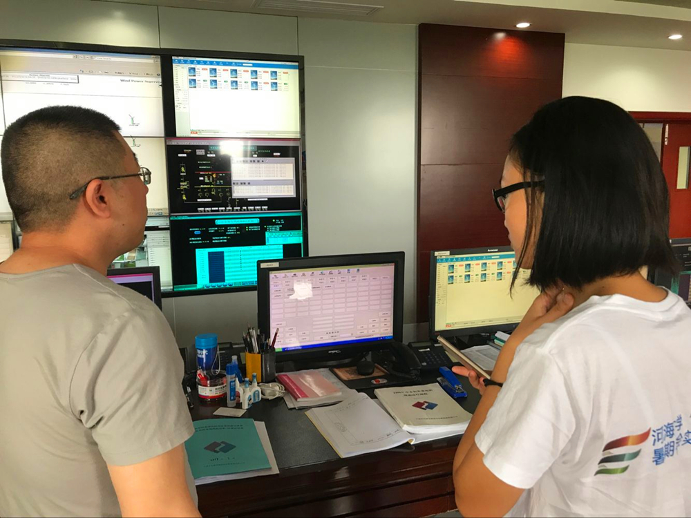 刘政委和冯部长带领实践团参观了风机制造厂、中水电集团如东新能源有限公司和华能江苏风电分公司的两个海上风电场,队员们从制造、建设到使用全方面了解了海上风机。在风机制造厂,队员们近距离地见识到这些将被安置于海上的庞大设备,对于风机的各部分结构也有了更深的认识。在两家风电场,队员们参观了场内设备和投入使用的风机。负责人带领队员们浏览了从监控所有设施的中控室,到用于检验故障的继电保护室,到负责变压的主变室等电厂内部构造,并详细介绍了风机所产生的电能如何在风电场经过变压等处理输入电网,以及风电场自身的运行情况和常见问题。队员们还获得了前去潮间带参观正在运行的风机的机会,当天适逢天公作美,可见一行行排列井然的风机在强劲的海风中平稳地转动。队员们在现场积极询问有关动力响应等问题,也得到了负责人细致认真的回答。海上风电场参观对调研团意义非凡——既见识到了风机和风电场的运行实情,又在工作人员的讲解下获得了丰富的专业知识。