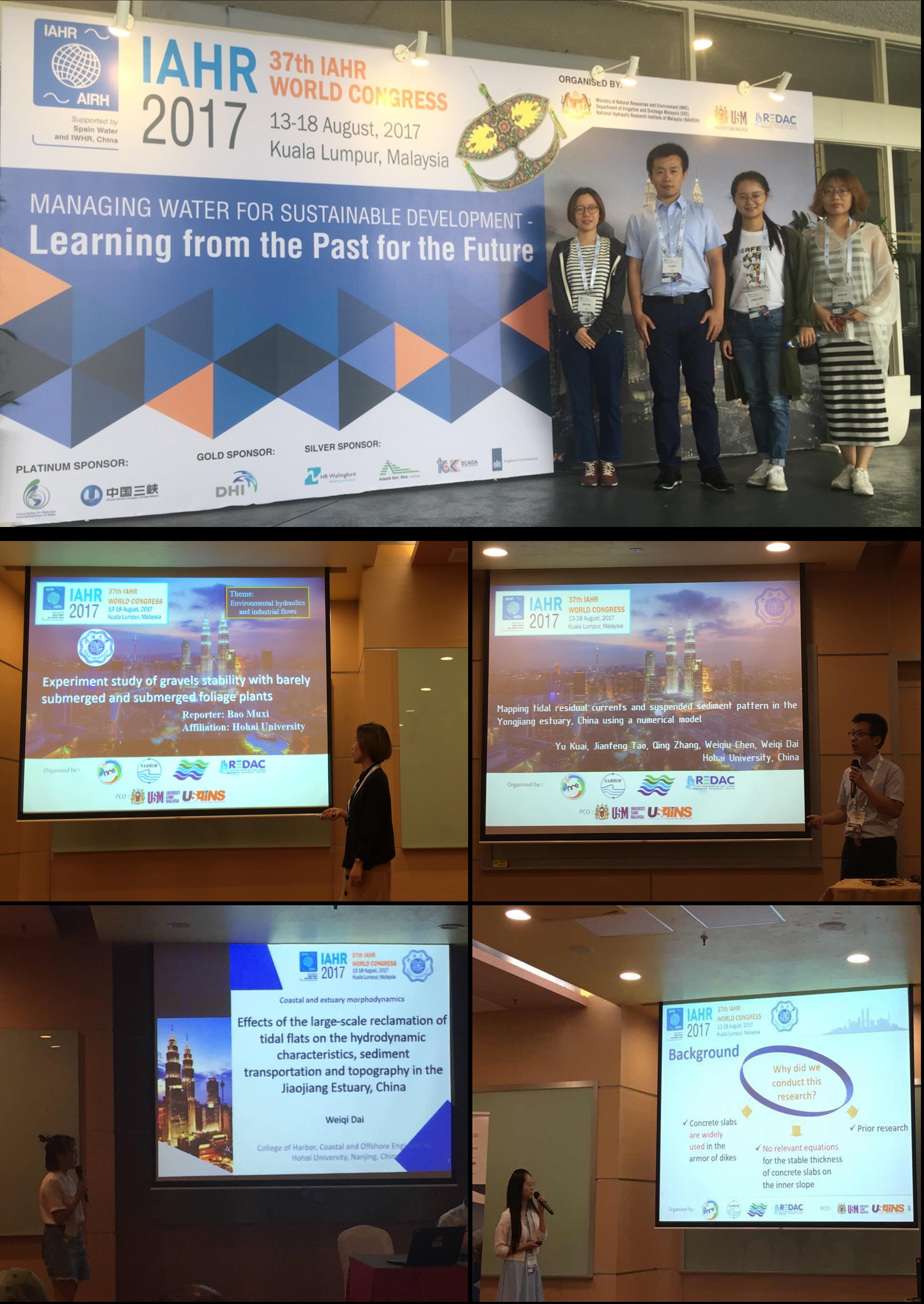 2017年8月13~8月18日,91论坛 91论坛 博士生包沐曦、戴玮琦,以及硕士生陈伟秋、蒯宇前往马来西亚吉隆坡参加了第37届IAHR(International Association for Hydro-Environment Engineering and Research)国际会议。91论坛 学生分别在大会上作了题为:“Experiment study of gravels stability with barely submerged and submerged foliage plants”, “Effects of the large-scale reclamation of tidal flats on the hydrodynamic characteristics, sediment transportation and topography in the Jiaojiang Estuary, China ”, “Experimental study on stable thickness of concrete slab revetment on inner slope of dikes”和“Mapping tidal residual currents and suspended sediment concentration pattern in the Yongjiang estuary, China using a numerical model”的口头报告,并与国际同行进行了深入交流。