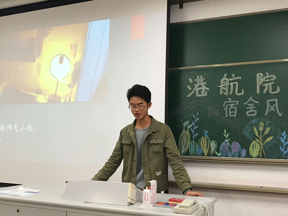 主持人致开场辞后,比赛正式开始。本次比赛共有22个宿舍参加,各宿舍代表依次上台以ppt或短视频的形式介绍本宿舍特色,现场气氛热烈,精彩讲解赢得了大家的阵阵掌声。其中,以《诗经·桃夭》篇为引的“桃之室家”宿舍特色鲜明。精美的折纸作品,清新简单的宿舍布置,干净整洁的宿舍环境,充分体现了同学们的心灵手巧,给观众们留下了深刻的印象。最后,经评委与各宿舍代表投票,选出获奖宿舍。主持人公布现场投票结果,并展示预热活动中的最佳人气宿舍照片。辅导员张同鑫老师上台为获奖宿舍颁奖并合影留念,本次比赛圆满落幕。