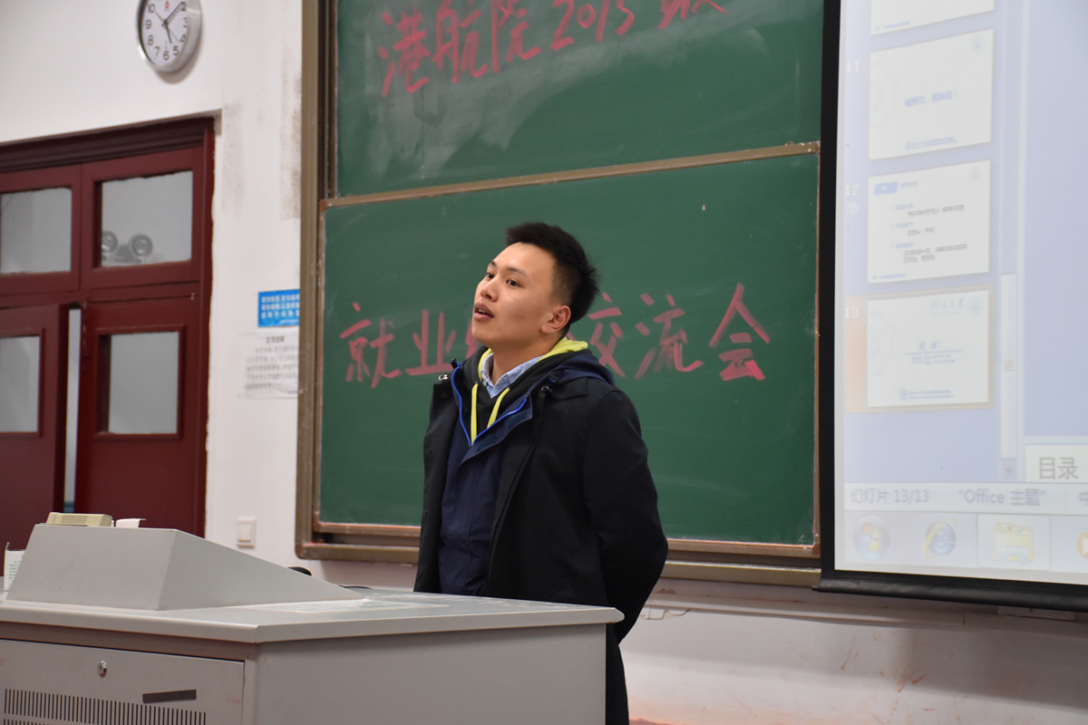 接下来,2015级优秀研究生代表黄珊珊和刘泓向大家分享经验。两位已经进入理想工作单位的研究生以轻松互动的形式,结合自身应聘经验,为同学们介绍了自己所了解的今年港航专业就业情况,分享了自己在面临读研,就业,选择用人单位等重大选择时慎重决断的过程,结合国内大环境下港航专业的发展趋势,提醒同学们利用大学生活学习的时间不断为将来做准备;同时在应聘时从个人能力、简历到面试方面进行充分的准备,勇敢从容地进行应聘。