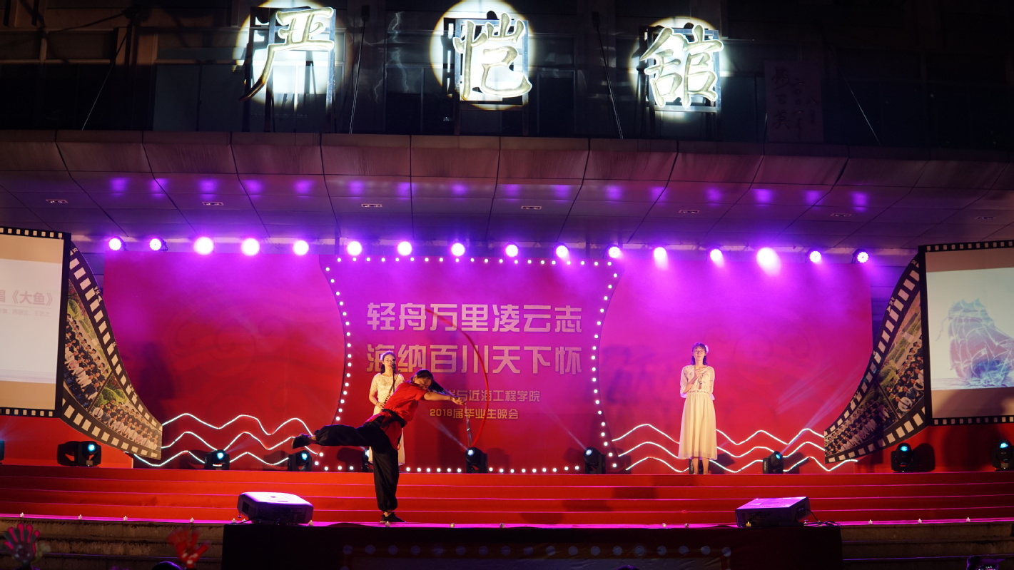 忆往事流光,思绪纷飞,感慨万千。由2014级辅导员季超老师,班导师赵红军、郝嘉凌、冯兴国老师,14级港航2班、4班带来的舞蹈串烧瞬间点燃了现场的气氛,他们幽默欢快的舞蹈赢得了现场观众的阵阵掌声。由章乐远等研究生带来的学术道德小品《我们不一样》,用鲜明的故事、轻松诙谐的剧情带给同学们深深的警醒。接下来蒋勤老师为同学们带来一首独唱《父亲》,蒋老师厚重有力的歌声如黄钟大吕,直击人心,现场有很多人都被歌声里的情绪所感染。孙雯怡等4位“校园十佳歌手”带来的歌曲串烧《我的朋友,不说再见》,展现出青春的张扬和美丽。陈雪、陈丽吉和王艺之同学将器乐歌唱《大鱼》与双截棍演绎相结合,一静一动,相得益彰,让观众如痴如醉。