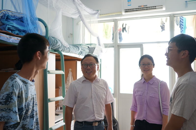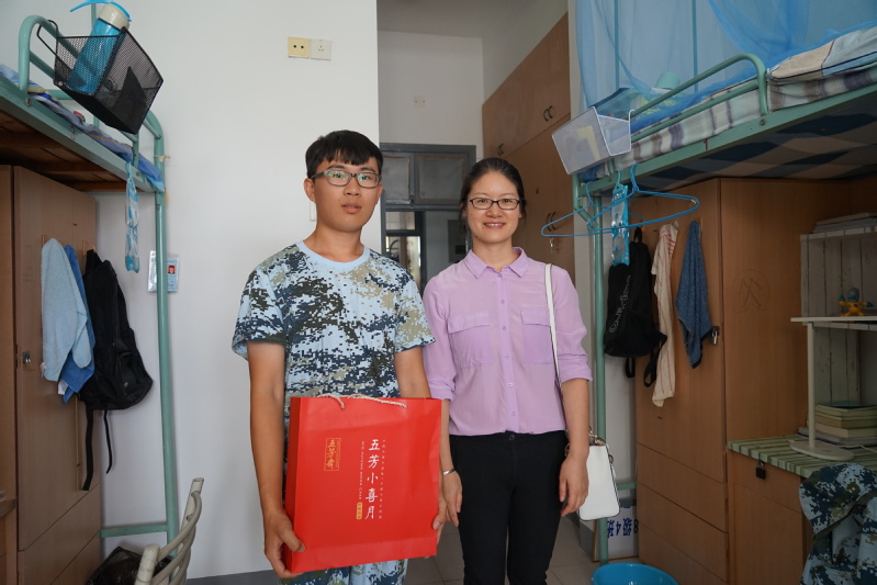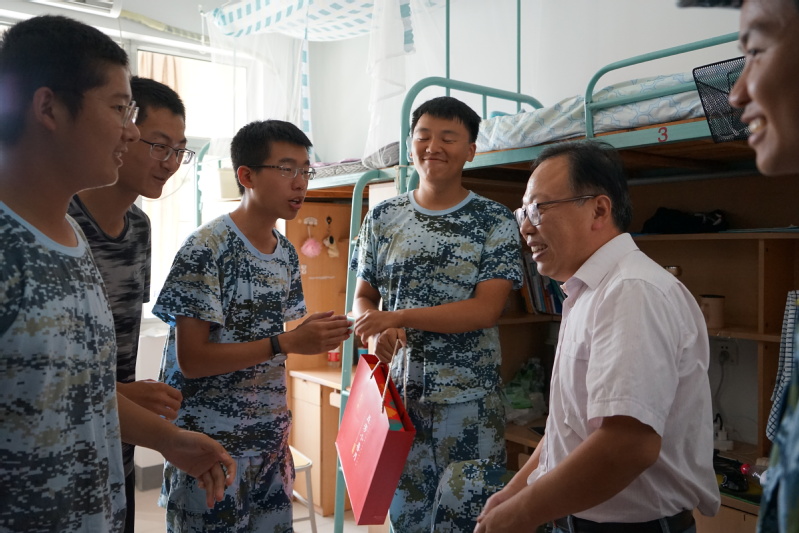 2018年9月23日,91论坛 党委书记胡忠华、副书记姜海霞在2016级辅导员张同鑫、2018级辅导员顾钰恒的陪同下,来到江宁校区教学区三舍和十舍,亲切慰问军训结束的新生并赠送91论坛 精心准备的月饼。