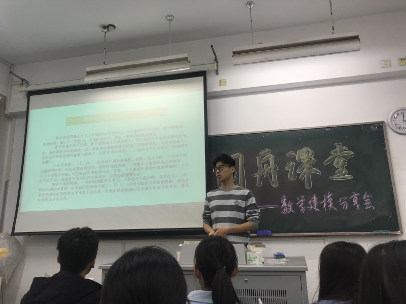 王大威学长表示,数学建模竞赛是全国高校规模最大的大学生基础性学科竞赛之一,其重要程度不言而喻。他通过PPT的形式简要地介绍了数学建模大赛的流程,并结合备赛与参赛过程分享了自己的切身感受。对于前期准备,他建议大二同学尽早规划,争取充裕的时间去准备。对于赛时的培训,由于建模大赛难度系数相对较高,所以培训过程中坚持与吃苦耐劳是参赛者所必备的心态。
