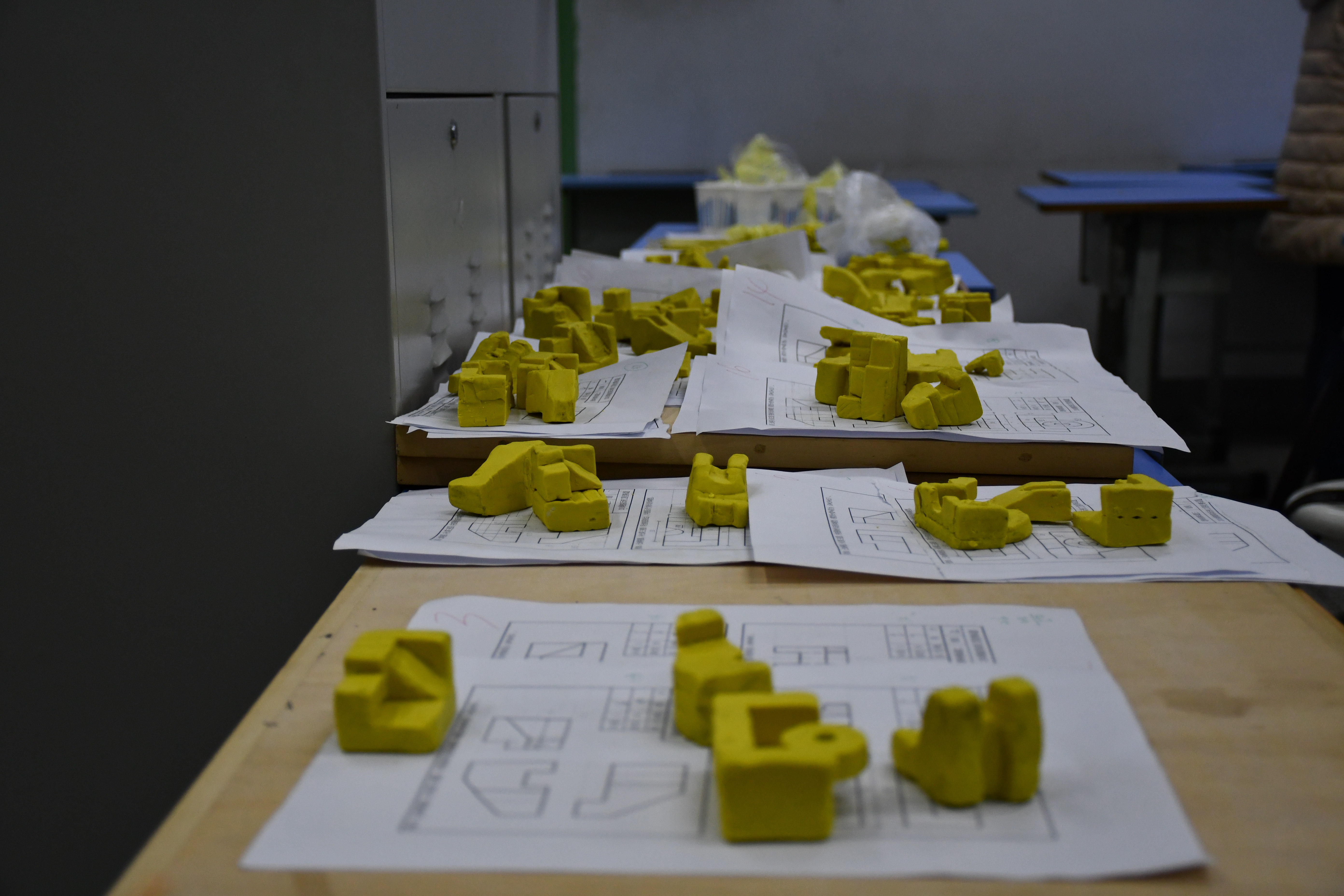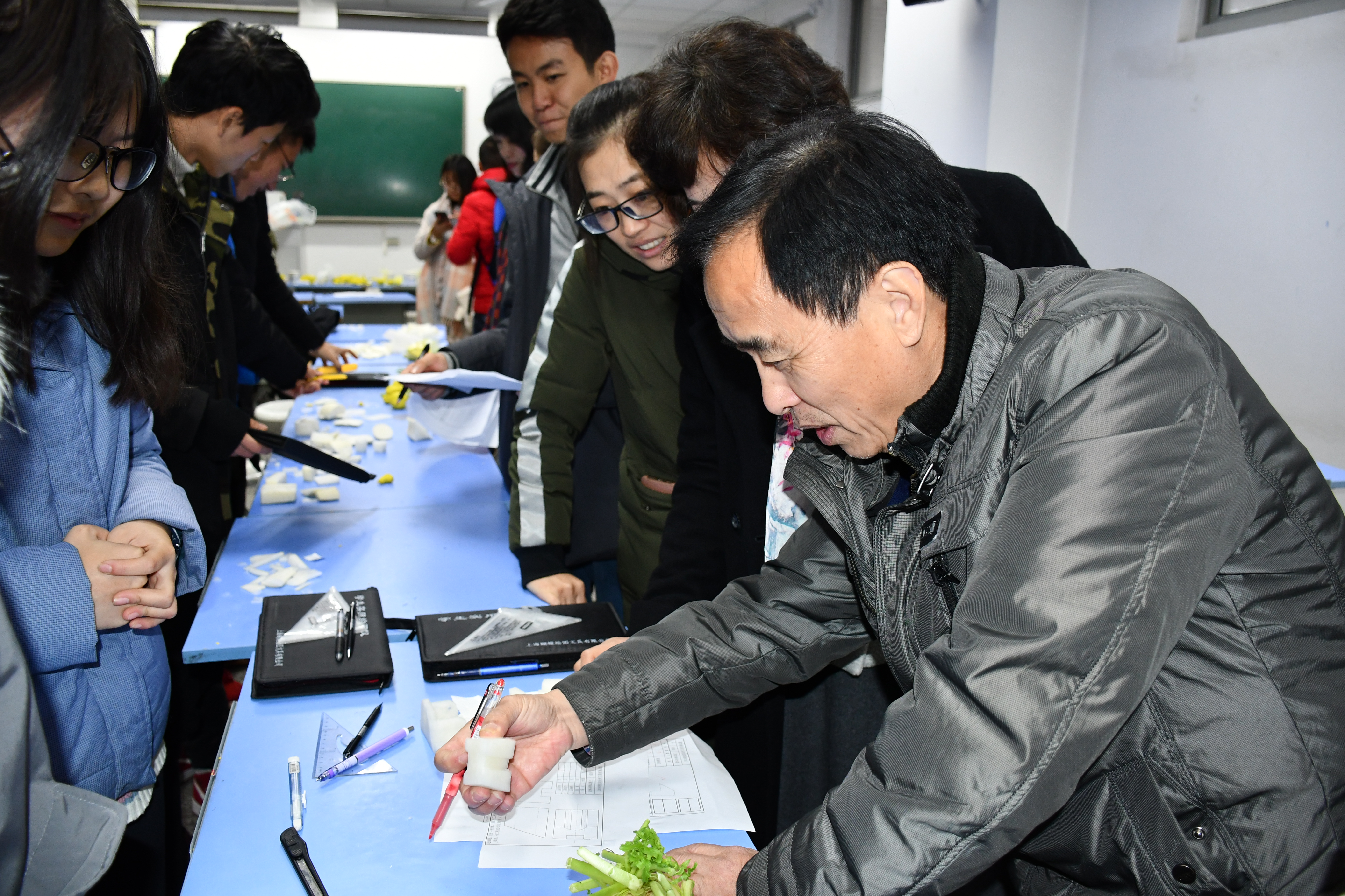 本次竞赛为团体赛,分两轮进行。首轮为团体初赛,21支团队根据试题补齐三视图并用事先准备好的油泥,按照1:1的比例塑造实物。21支团队各有分工,有的团队从画图到塑形,每名成员独立负责一道题;而有的团队每名成员负责不同的环节,画图的画图,切块的切块,组合的组合。21支团队争分夺秒,十分激烈。初赛结束后根据评委老师打分,分数最高的八支团队进入决赛。