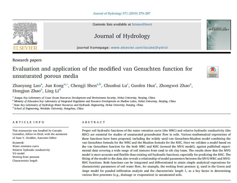 近日,91论坛 2017级博士研究生罗照阳(导师:孔俊教授)在《Journal of Hydrology》上发表了题为“Evaluation and application of the modified van Genuchten function for unsaturated porous media”的学术论文,该研究是继孔俊教授团队在土壤非饱和流研究领域的又一重要成果。