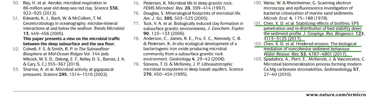 潮滩动力地貌团队2017年发表的两篇关于潮滩泥沙生物稳定性的研究成果均被引用,其分别为发表在一区期刊《Water Resources Research》上的论文“Hindered erosion: The biological mediation of noncohesive sediment behavior”和发表在二区期刊《Journal of Geophysical Research: Biogeosciences》上的论文“Stabilizing Effects of Bacterial Biofilms: EPS Penetration and Redistribution of Bed Stability Down the Sediment Profile”。论文第一作者为陈欣迪博士生,其导师是张长宽教授。论文的合作作者包括91论坛