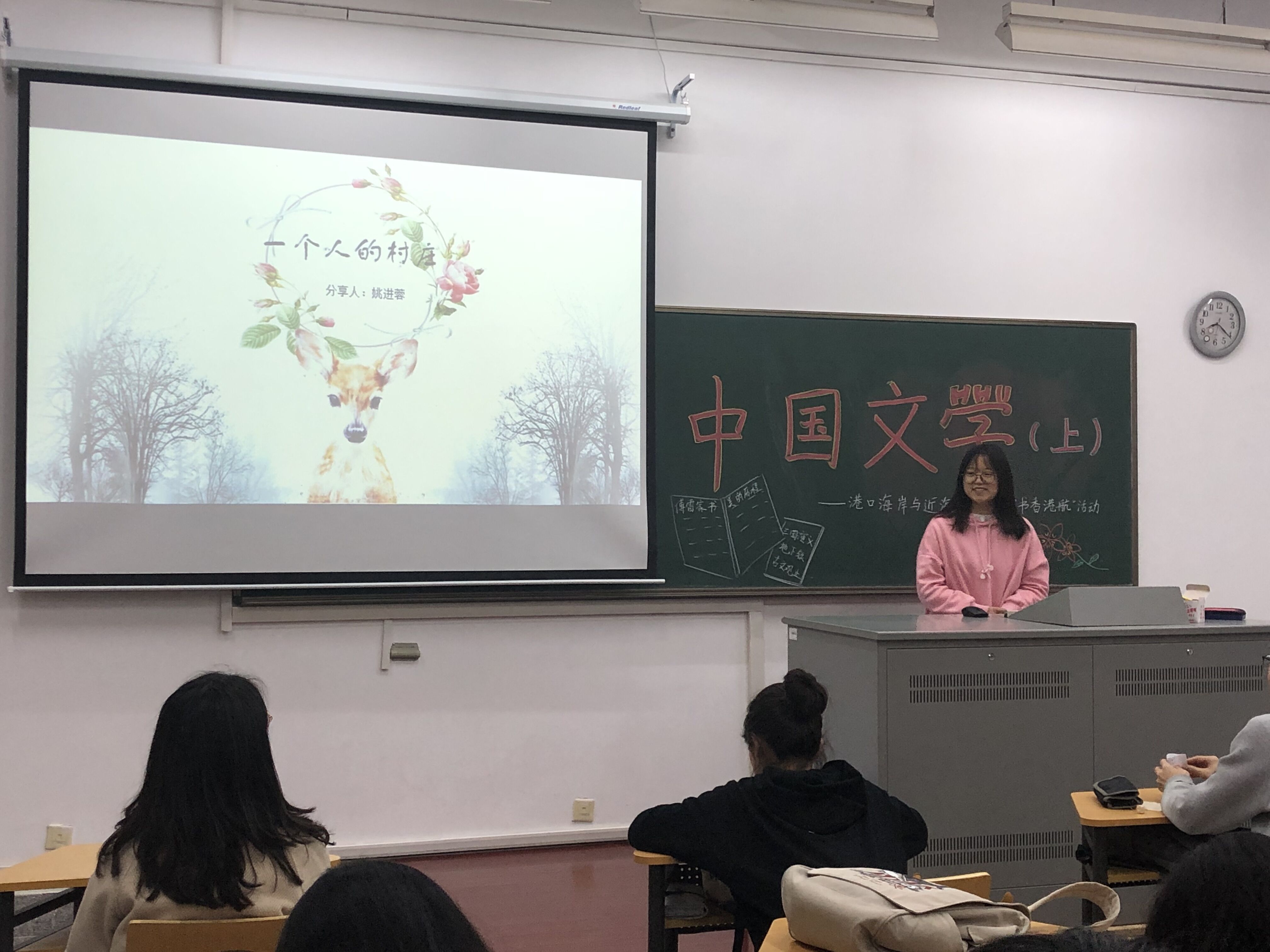 2018级的20余位同学齐聚一堂,对中华文化追本溯源,碰撞出思维的火花。读书交流分享会在18:30准时开始。第一位上场的苏雅莹同学用清新简约的插画书《地下铁》,讲述了一个看不见世界的少女用童真的小心灵去聆听这个世界,在她的世界里,一切都是美好,温暖,幸运的,即便处于逆境之中,也能看到幸福的光芒。紧接着上场的徐双余同学讲述了李泽厚眼中的美,娓娓道来《美的历程》。张高远同学则选择了颇具古典韵味的《古文观止》,向到场的同学展现古文之美。在《文化苦旅》中,陈钰同学选择了感悟余秋雨先生虔诚的、膜拜的和陶醉的 审美心境,感悟人生真谛和对文化灵魂的探索。于昕彤同学则选择用与自生经历相结合的方式讲述《撒哈拉的故事》,最后上场的姚进蓉同学带来了散文集《一个人的村庄》,诉说对土地的热爱。整场活动在安静、享受的氛围中结束。