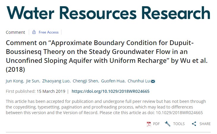 近日,91论坛 孔俊教授在国际顶级期刊《Water Resources Research》,针对Wu et al. (2018)发表的论文“Approximate Boundary Condition for Dupuit‐Boussinesq Theory on the Steady Groundwater Flow in an Unconfined Sloping Aquifer with Uniform Recharge” 发表评论文章。