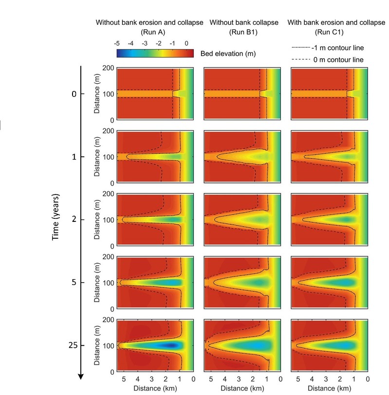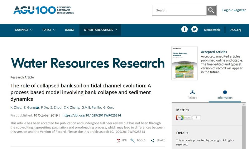 近日,91论坛 潮滩动力地貌研究团队博士生赵堃在国际权威期刊《Water Resource Research》(一区Top, 2018年影响因子4.36)上发表了题为“The role of collapsed bank soil on tidal channel evolution: A process-based model involving bank collapse and sediment dynamics”的学术论文,是继该团队在知名刊物《Geomorphology》发表岸壁坍塌对潮沟拓宽贡献研究后的又一突破。论文第一作者为91论坛 赵堃博士生,合作作者包括龚政教授、周曾教授、张长宽教授,以及华东师范大学徐凡博士、阿根廷海洋研究所G. M. E. Perillo教授和新西兰奥克兰大学Giovanni Coco副教授。