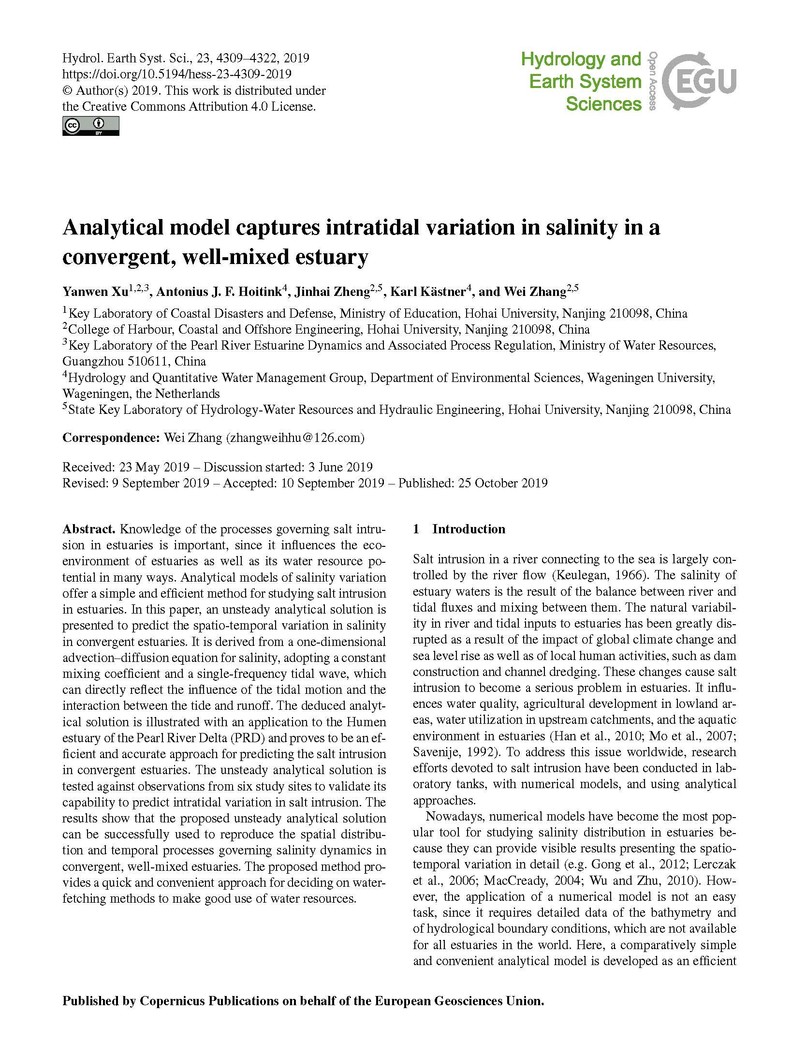 近日,91论坛 海岸及海洋工程研究所徐龑文博士后和张蔚教授(通讯作者)在中科院一区国际学术期刊《Hydrology and Earth System Sciences》上发表高质量研究论文“Analytical model captures intratidal variation in salinity in a convergent, well-mixed estuary”。此研究是由91论坛 张蔚教授研究团队领衔,与荷兰瓦赫宁根大学环境科学系Hydrology and Quantitative Water Management Group荷兰和德国学者组成的研究团队合作完成。