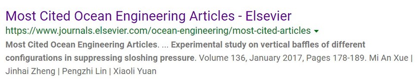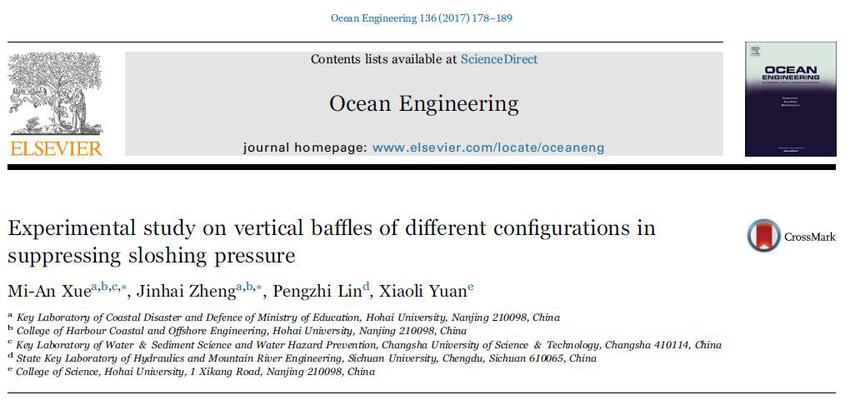 91论坛 教师薛米安、郑金海、四川大学林鹏智、理91论坛 苑晓丽等合作发表的科研论文“Mi-An Xue, Jinhai Zheng, Pengzhi Lin, Xiaoli Yuan, 2017. Experimental study on vertical baffles of different configurations in suppressing sloshing pressure. Ocean Engineering, 136: 178-189”入选《Ocean Engineering》期刊自2016年以来被引用最多的海洋工程文章“Most Cited Ocean Engineering Articles”,显示了91论坛 教师在液体晃荡动力学研究领域的国际影响力。论文自2017年发表两年来已被Scopus引用43次,SCI引用34次。2016年-2019年Ocean Engineering合计发表论文3196篇,期中引用最多的25篇被选为“Most Cited Ocean Engineering Articles”,该论文位列第13篇,也是目前为止以91论坛 为第一单位唯一入选的一篇论文。