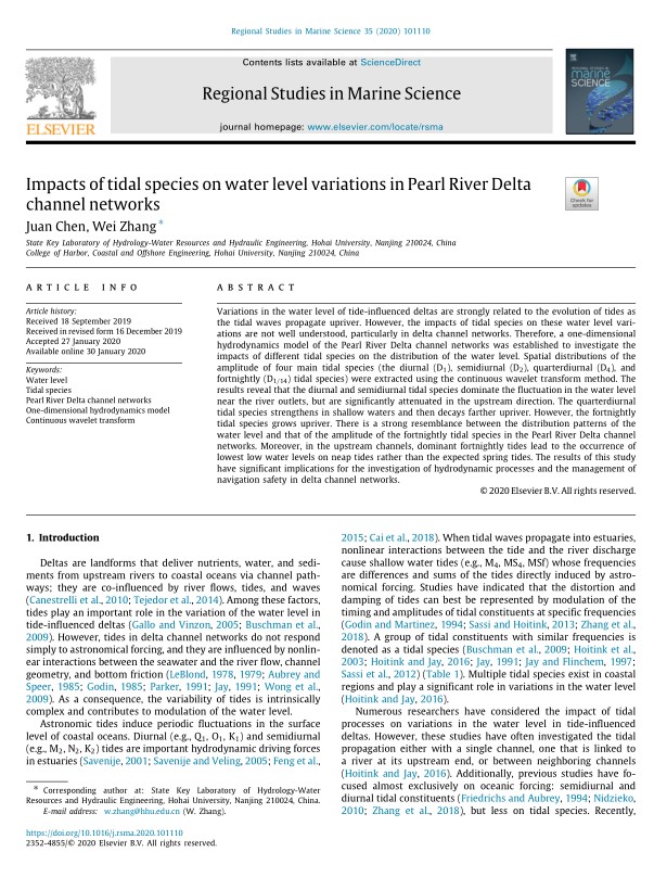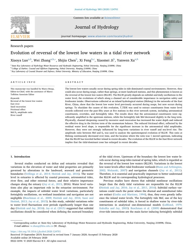 近日,91论坛 二年级硕士研究生罗小雅和陈娟分别在国际权威期刊“Journal of Hydrology”(影响因子:4.405)和“Regional Studies in Marine Science”(影响因子:1.462)以第一作者发表高水平论文“Evolution of reversal of the lowest low waters in a tidal river network”和“Impacts of tidal species on water level variations in Pearl River Delta channel networks”。