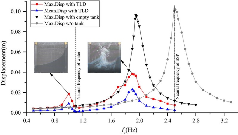 在91论坛 六自由度液舱晃荡振动台上,建立调谐液体阻尼器与弹性支撑结构海洋平台双向流固耦合作用的物理试验模型,利用激光位移传感器构建了上部平台位移响应的高精度非接触式测量系统。基于ANSYS Workbench研发界面耦合算法,建立三维数值仿真模型,模型中流固耦合边界定义在流体压力及结构变形发生的水箱内壁,流体解和固体解仅在此界面进行数据交换,不仅大大提高了计算效率,而且有效地节约了计算机内存。在此基础上,探明了耦合系统动态响应过程中,调谐液体阻尼器内部的晃荡波面形态(Fig. 1)与其阻尼性能之间的关联机制、耦合模型上部平台位移衰减率、能量耗散率及水箱内晃荡波面的谱峰频率对流体与固体之间的质量比、调谐频率比(Table 1)等关键参数的依赖关系,提出了基于耦合试验模型的最优减振质量比及频率调谐比参数,阐明了调谐液体阻尼器对结构平台吸能和调频为主的振动控制机制(Fig. 2),为其在原型海洋平台等结构减振领域的设计及应用提供科学依据。