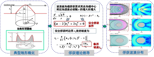 基于射线理论和长波方程发展了岛链海脊地形和岛礁环状地形影响下的波浪传导-俘获解析理论,解释了岛礁背浪面产生波浪辐聚的原因。