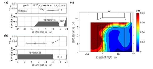 图1.2.5 珊瑚礁海岸礁坪-潟湖-裂口地形上的波高分布