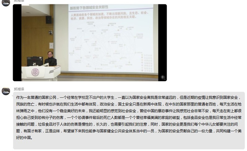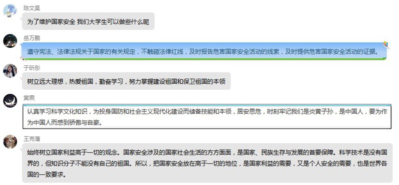 “同上一堂国家安全教育课”后,各班级、支部通过qq、微信群等开展线上讨论、“云”班会,结合当前疫情防控形势,围绕“国家安全的内涵”、“中国特色国家安全新道路”、“大学生能在维护国家安全工作中做什么”等问题进行交流。