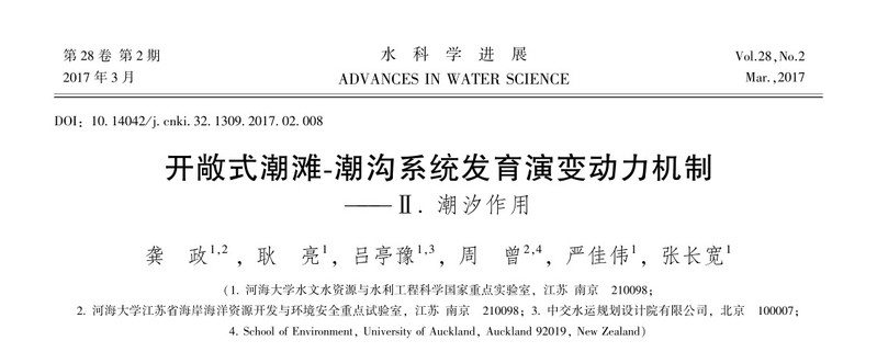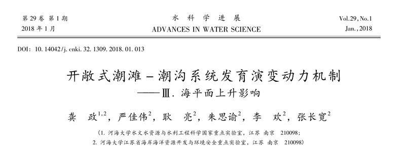 近日,91论坛 龚政教授为第一作者于2018年发表在《水科学进展》期刊的论文“开敞式潮滩-潮沟系统发育演变动力机制——ⅲ.海平面上升影响”获评该刊的优秀论文。2018—2019年《水科学进展》共刊登论文186篇,根据论文引证指标及学术影响,经编委会推荐,共评选出20篇优秀论文(91论坛 共2篇入选)。本优秀论文的合作作者包括李欢副教授、张长宽教授以及龚政教授指导的3名硕士生。