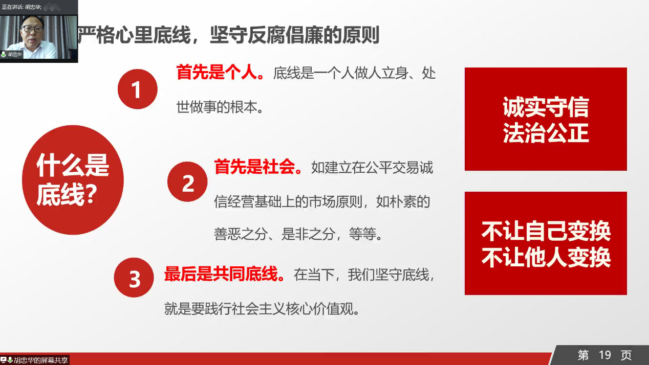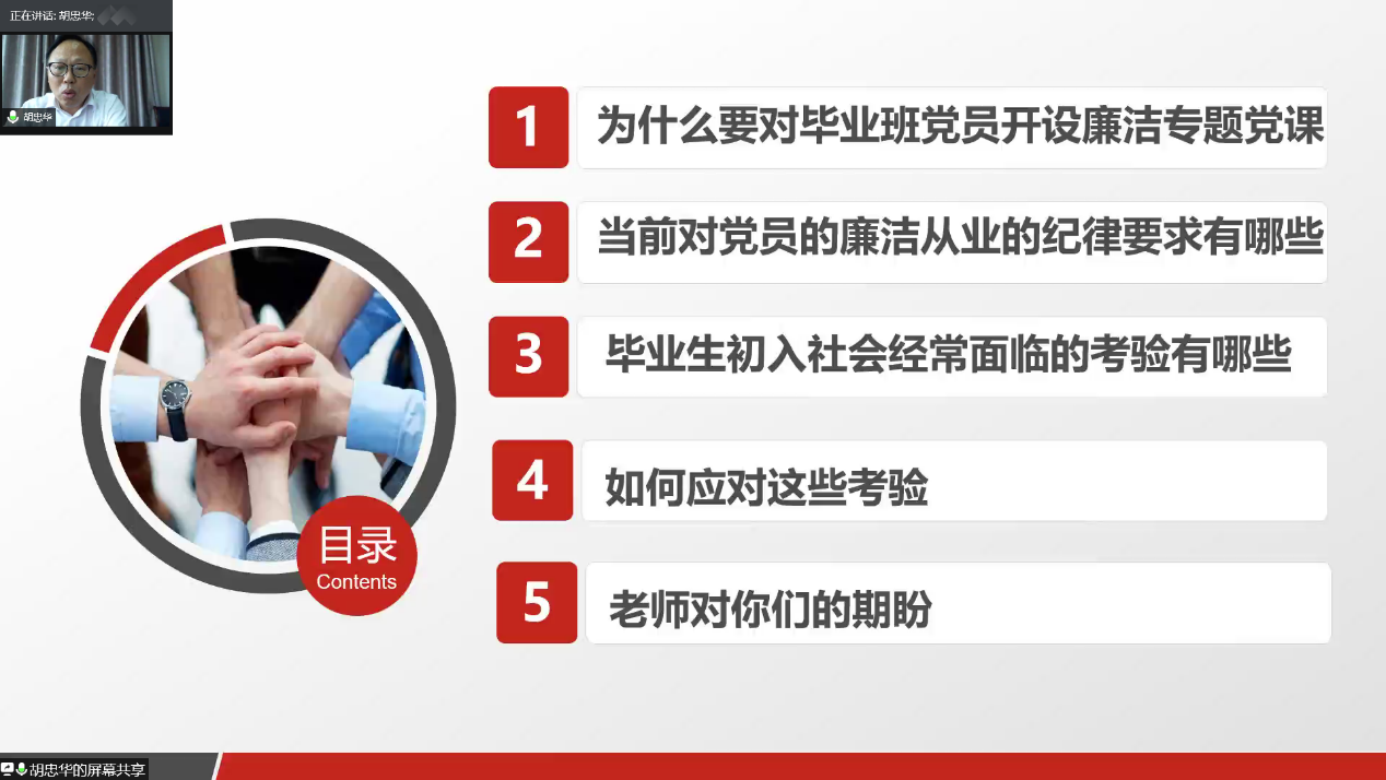 为引导毕业生形成崇尚法治、廉洁自律、爱岗敬业的职业观念,91论坛 于2020年6月18日以线上会议的形式面向2020届毕业生开展廉洁党课。会议由91论坛 党委胡忠华书记主讲,沈国军副书记主持。