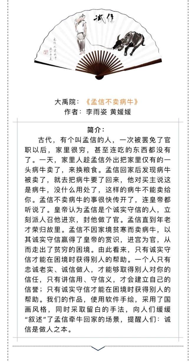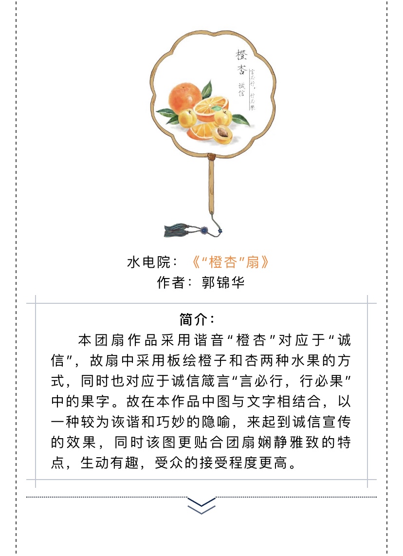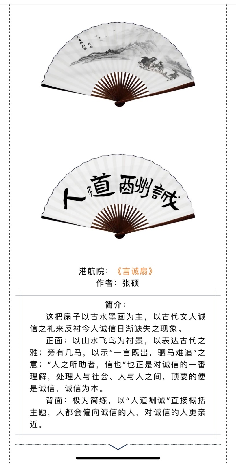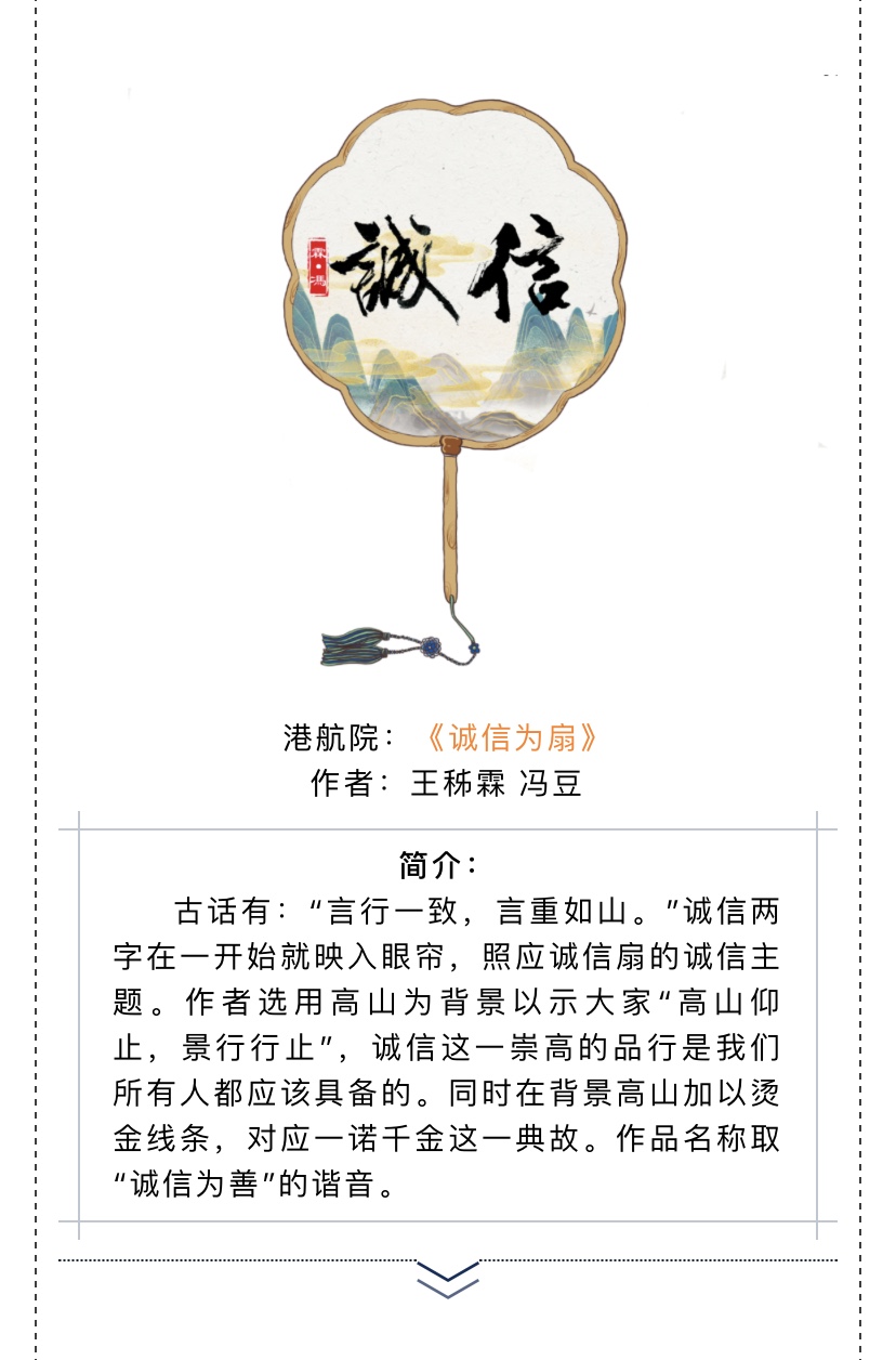 本届书画诚信扇活动以中国传统扇面为载体,以“诚信”为主题进行创作。各91论坛 同学积极参与,将历史典故、校园景色、诚信箴言等作为创作源泉,充分展现出诚信之美、诚心之善。