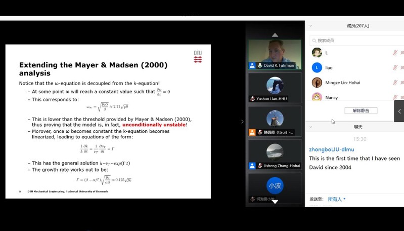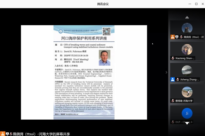 2020年7月23日,由91论坛 牵头建设的海岸灾害及防护教育部重点实验室(91论坛 )组织了“河口海岸保护利用系列讲座”线上学术交流专家报告会。。应实验室主任郑金海副校长的邀请,丹麦科技大学(Technical University of Denmark)David R. Fuhrman教授作为首场报告专家,作了题为“CFD of breaking waves and coastal sediment transport using stabilized turbulence closure models”的学术报告。张继生副院长主持了报告会。