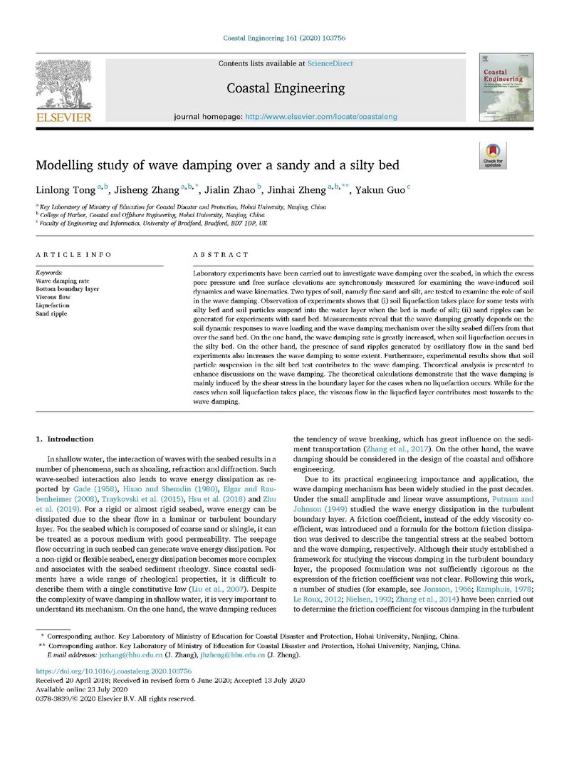 近日,91论坛 童林龙博士后与合作导师郑金海教授、张继生教授在海岸工程类顶级期刊《Coastal Engineering》(91论坛 A类期刊,中信所1区,影响因子4.119)上发表题为:“Modelling study of wave damping over a sandy and a silty bed”的研究论文。