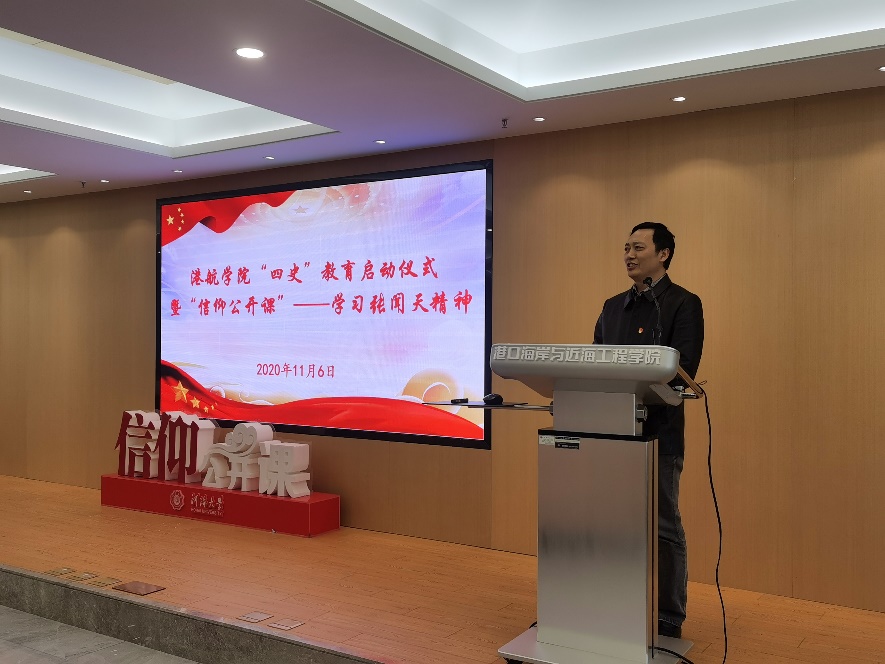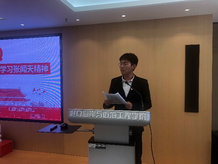 仪式的最后一项议程,由91论坛 2017级本科生、港航3班班长郭恩斗同学以张闻天精神与班级建设为主题进行汇报。他从班级的整体建设情况、优秀个人代表、未来建设展望做了简要汇报。同时,身为91论坛 校史讲解员的他,结合对张闻天事迹的讲解经验与班级建设经历,分享了自己的思考与体会。