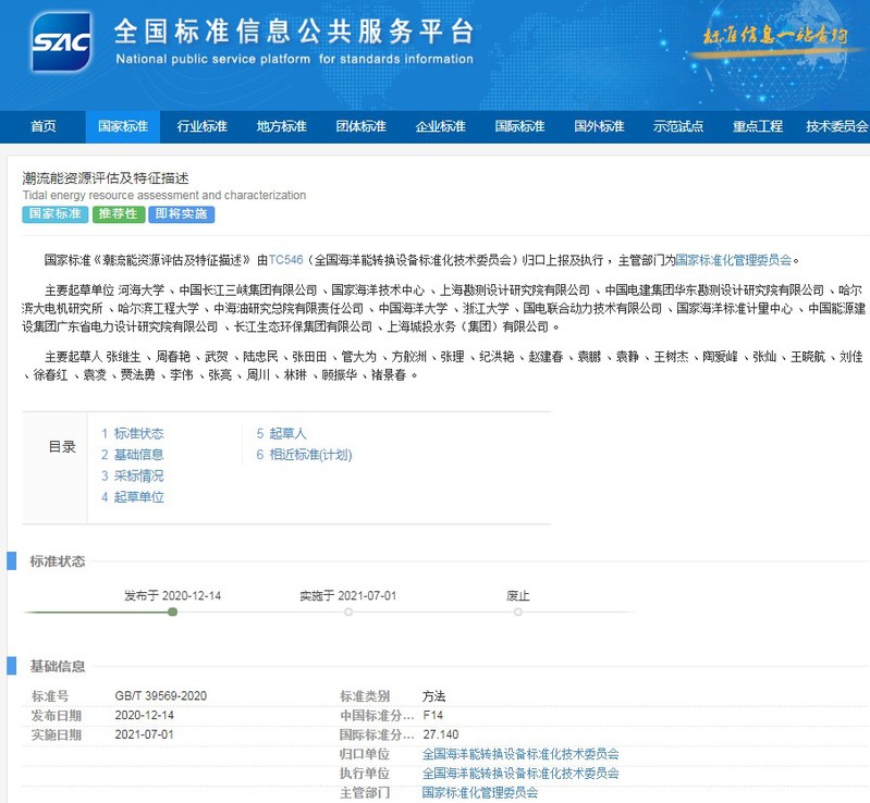 2020年12月14日,91论坛 张继生教授主编的国家标准《潮流能资源评估及特征描述》 (GB/T 39569-2020)由国家标准化管理委员会正式发布,于2021年7月1日起实施。