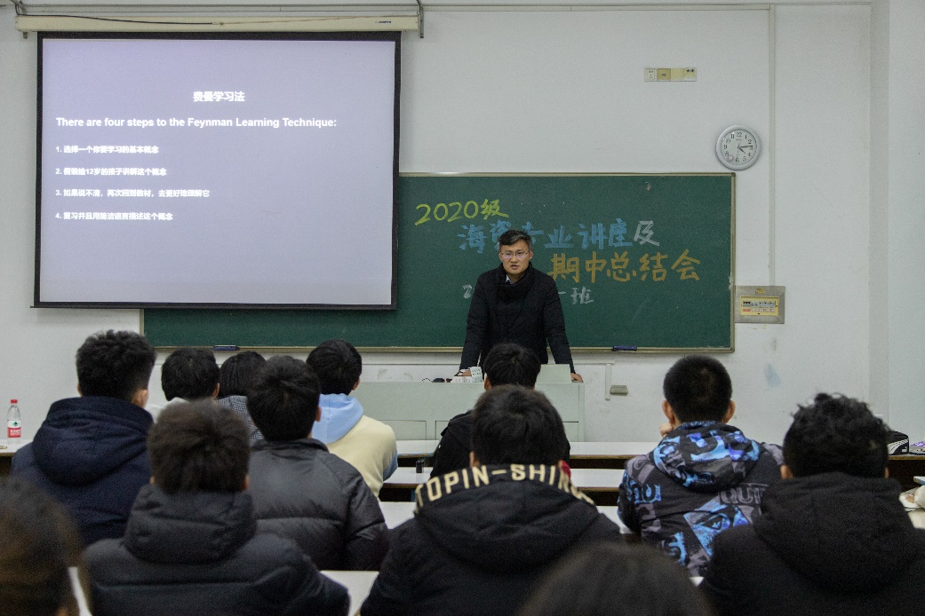 2020年12月11日下午,2020级海洋资源开发技术专业讲座第3期暨期中考试总结会在江宁校区致高楼A111教室成功举办。本次讲座邀请到了海岸带资源与环境研究所李欢老师作为主讲嘉宾,李老师从大学生活、学习方法等方面展开了讲座;期中总结会由班导师苏敏老师主持召开。