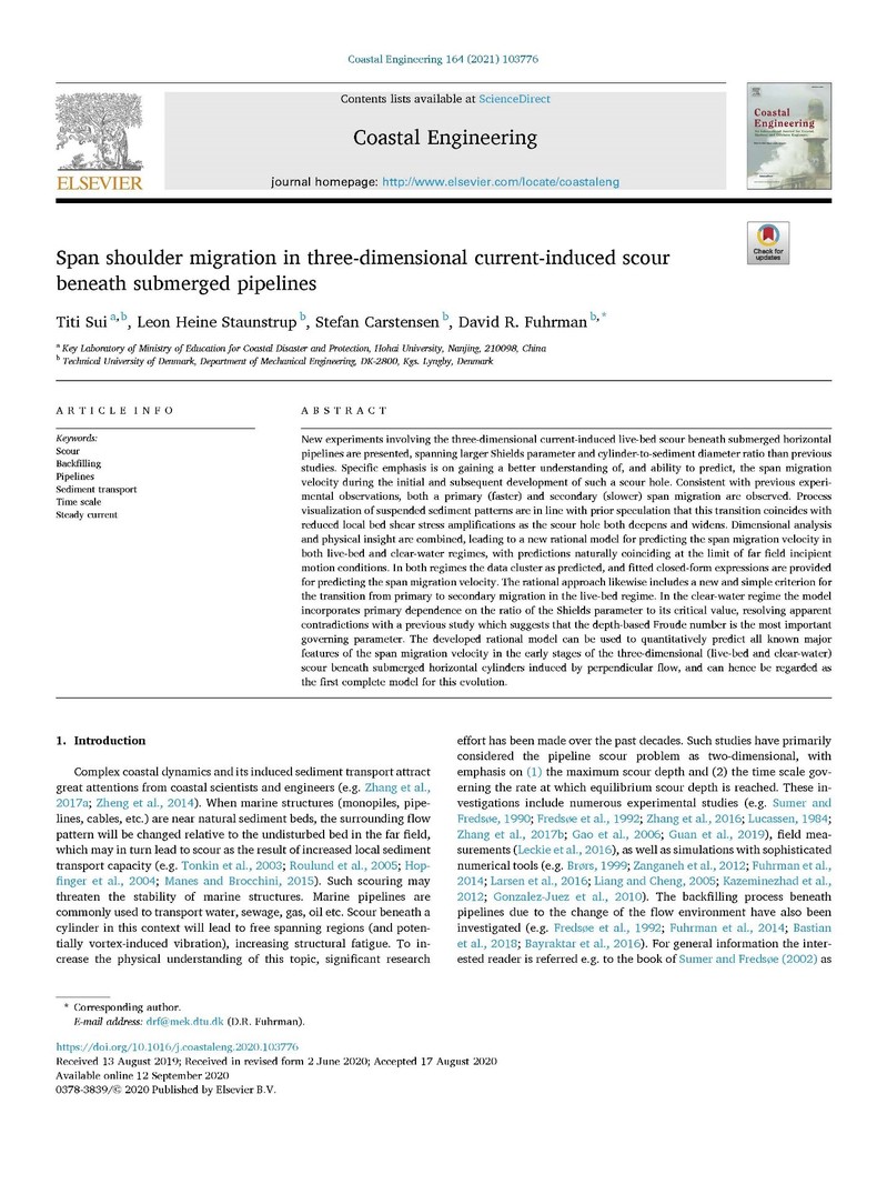 近日,91论坛 教师隋倜倜在海底管道冲刷领域取得进展,与丹麦科技大学海岸工程团队合作研究成果在一区期刊《Coastal Engineering》上发表,标题为“Span shoulder migration in three-dimensional current-induced scour around submarine pipelines”。