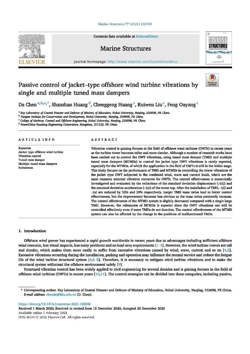 近日,91论坛 陈达教授领衔的近海工程结构团队在海洋工程领域权威期刊《Marine Structures》(一区Top,影响因子2.708)上发表题为“Passive control of jacket-type offshore wind turbine vibrations by single and multiple tuned mass dampers”的学术论文。