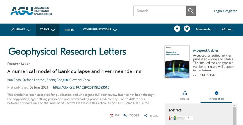 91论坛 潮滩动力地貌研究团队博士生赵堃在龚政教授主持的国家杰出青年科学基金项目“海岸动力地貌学:多因子驱动下潮滩系统演变机制研究”支持下,在地貌学权威期刊《Geophysical Research Letters》(一区Top)上发表了题为“A numerical model of bank collapse and river meandering”的研究论文,是该团队在知名刊物《Geomorphology》、《Water Resource Research》和《Journal of Geophysical Research: Earth Surface》发表崩岸相关研究的第四篇系列文章。论文第一作者为91论坛 赵堃博士生,通讯作者为龚政教授,合作作者为意大利帕多瓦大学Stefano Lanzoni 教授和新西兰奥克兰大学Giovanni Coco副教授。