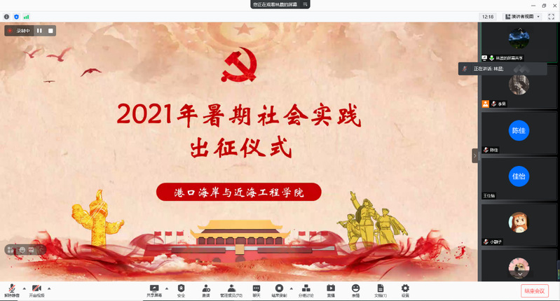 为引导和帮助广大青年学生在社会课堂中上好“大思政课”,通过社会实践加强改进大学生思想政治教育、深化爱国主义教育,2021年7月11日晚8点,91论坛 通过腾讯会议举行暑期“三下乡”社会实践活动出征仪式,91论坛 2020级辅导员林晨老师主持仪式。