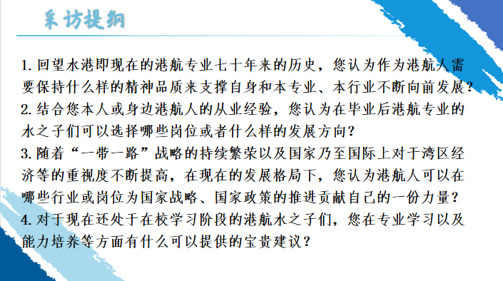 团队成员对华水水港专业83级校友吴文生先生进行线上采访。他结合自身在国内外参与工程的经历,向我们详细介绍了港口航道几十年来的发展历程,与当下国家推动建设一流港口、智慧航道的大方向。当谈及水港专业,他认为水港专业培育出的吃苦耐劳、扎实专业、勇于探索的品质,是在日后发展中宝贵的财富。