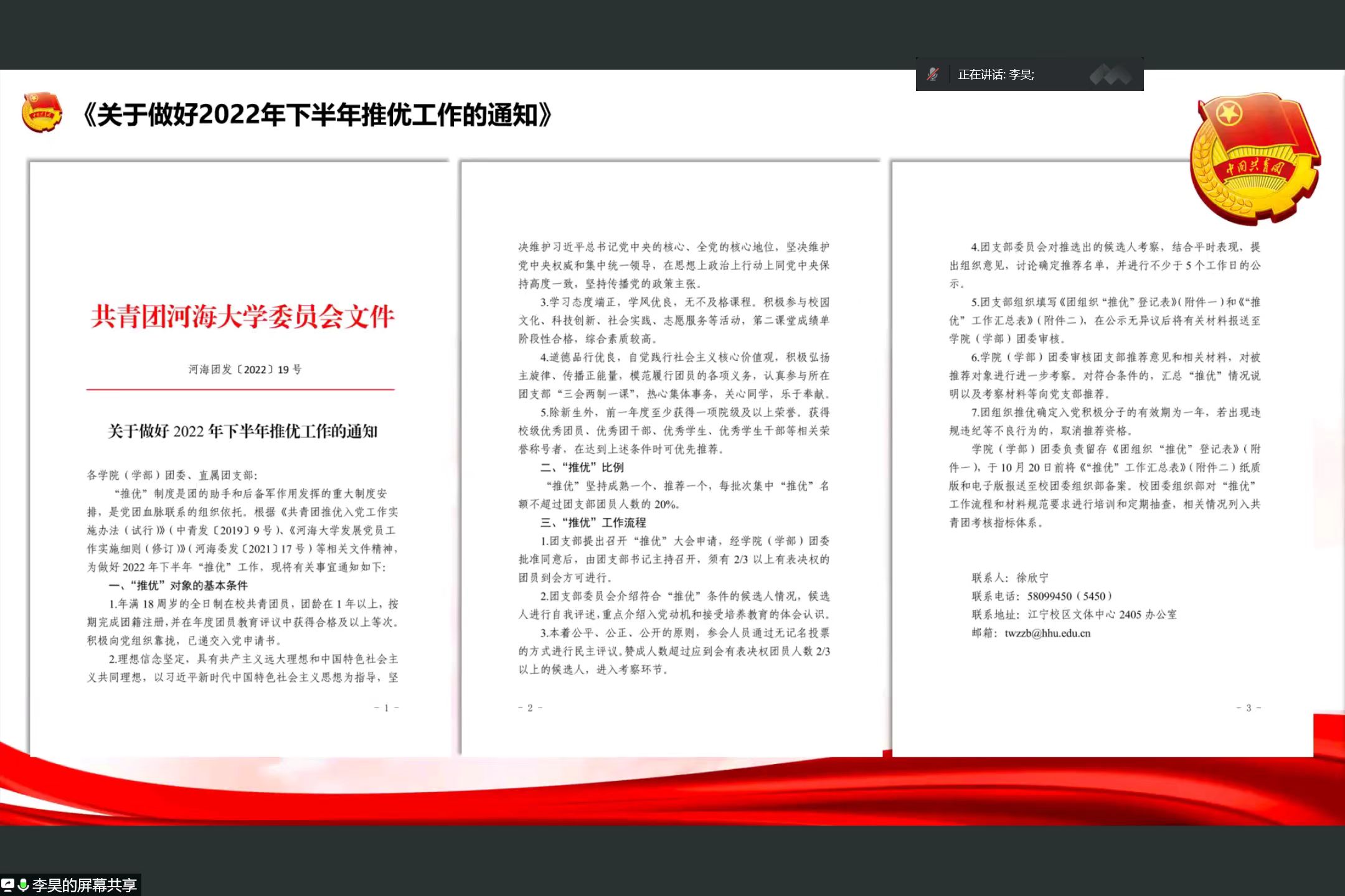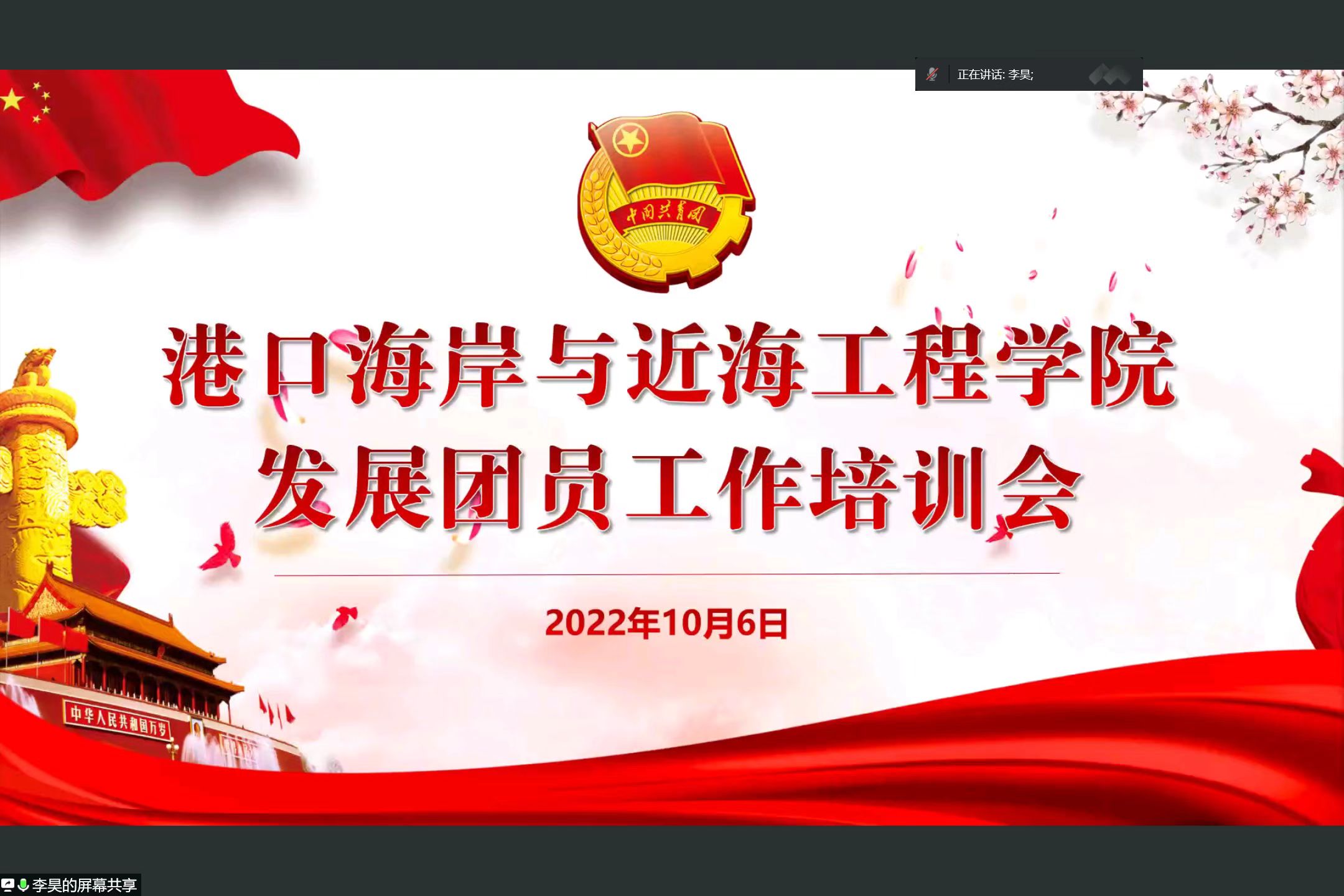 2022年10月6日,91论坛 组织员朱钰老师和团委副书记李昊面向全体2022级本科生就党团员发展工作做详细介绍,为进一步开展学生入党积极分子培养教育、学生党员发展和教育管理服务、指导学生党支部和班团组织建设等工作奠定基础。
