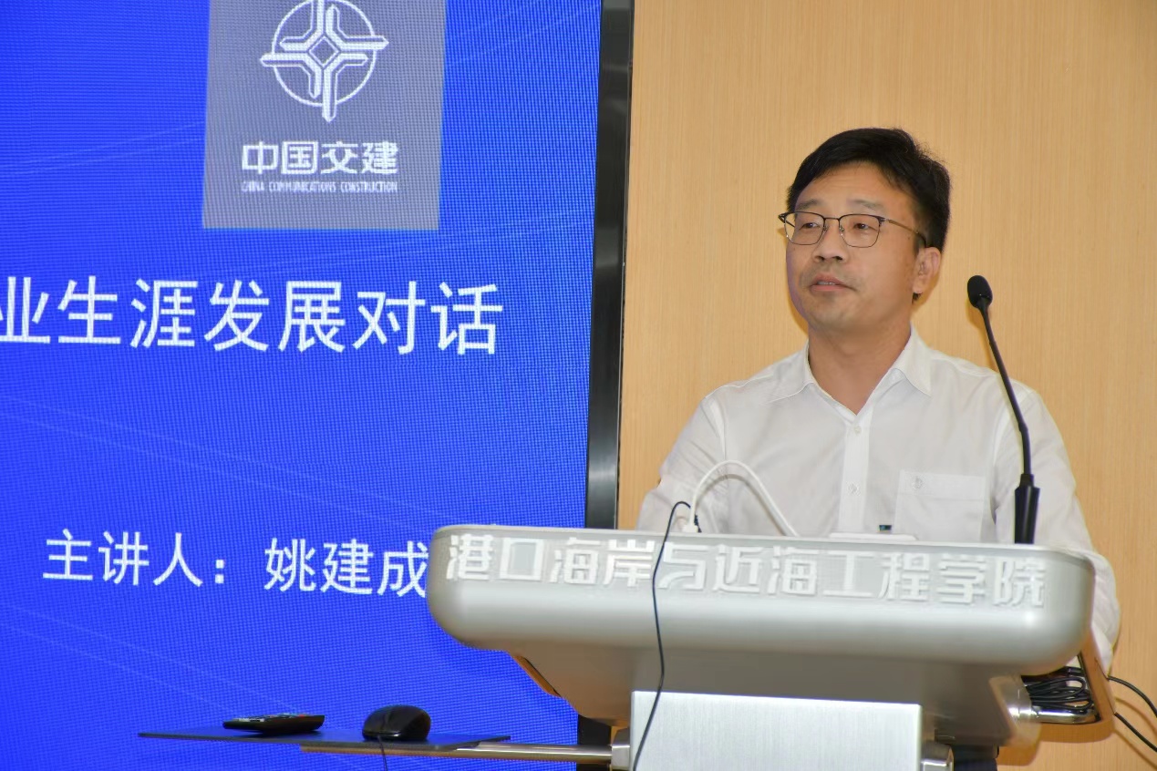 中交四航局五公司副总经理、港口航道及海岸工程专业2001级校友姚建成做了题为《重实践 建新功——职业生涯发展对话》的辅导讲座。姚建成首先介绍了个人工作经历与中交四航局的基本情况,具体讲解了目标设定的SMART黄金法则、职业定位的四大黄金原则、职业定位三大关键要素(TOP模型)等生涯规划理论,指导学生逐步完成生涯规划。随后,姚建成为同学们解读了中交四航局的职业发展分析,并结合自己的成长经历分享了从学生到企业工作者的角色转变的心得感悟,建议同学们认真学习、关心时事、多多参与、加强实践,期待同学们未来取得骄人的成绩。讲座后,同学们针对就业去向、海外工作、生涯发展等热点问题与用人单位开展了互动交流。
